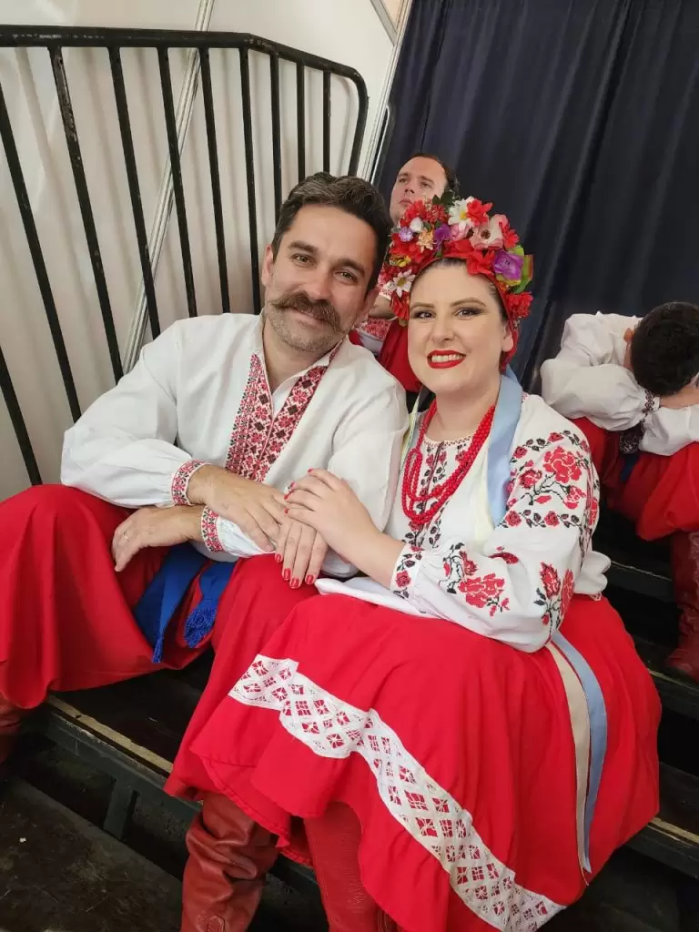 A paixão pela dança folclórica foi o que os uniu. Camila começou no grupo polonês, incentivada por uma amiga de escola, enquanto Alexis cresceu imerso nas tradições ucranianas, herança dos avós que vieram ao Brasil fugindo da guerra e ajudaram a fundar uma comunidade ucraniana em Canoas. Os dois se conheceram melhor nos bastidores de um evento no CTG 35 e logo começaram a namorar. O primeiro encontro oficial aconteceu na festa de 15 anos dela, realizada na Sociedade Polônia, local simbólico de onde sua jornada pela cultura começou. “A gente já está há 19 anos juntos”, diz com orgulho.